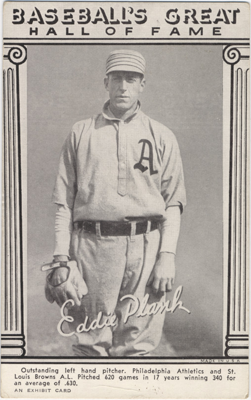 Portrait of pitcher Eddie Plank. Hall of Fame Exhibits series. Printed on front: "Baseball's great Hall of Fame. Eddie Plank. Outstanding left hand pitcher. Philadelphia Athletics and St. Louis Browns A.L. Pitched 620 games in 17 years winning 340 for an average of .630. An Exhibit card."