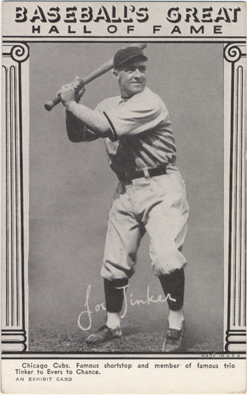 Portrait of shortstop Joe Tinker holding a baseball bat. Hall of Fame Exhibits series. Printed on front: "Baseball's great Hall of Fame. Joe Tinker. Chicago Cubs. Famous shortstop and member of famous trio Tinker to Evers to Chance. An Exhibit card."