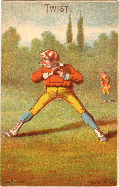 View of pitcher holding baseball, preparing to throw a pitch. Another baseball player stands in background. Printed on front: "Twist. Forbes Co., Boston, copyrighted 1878."