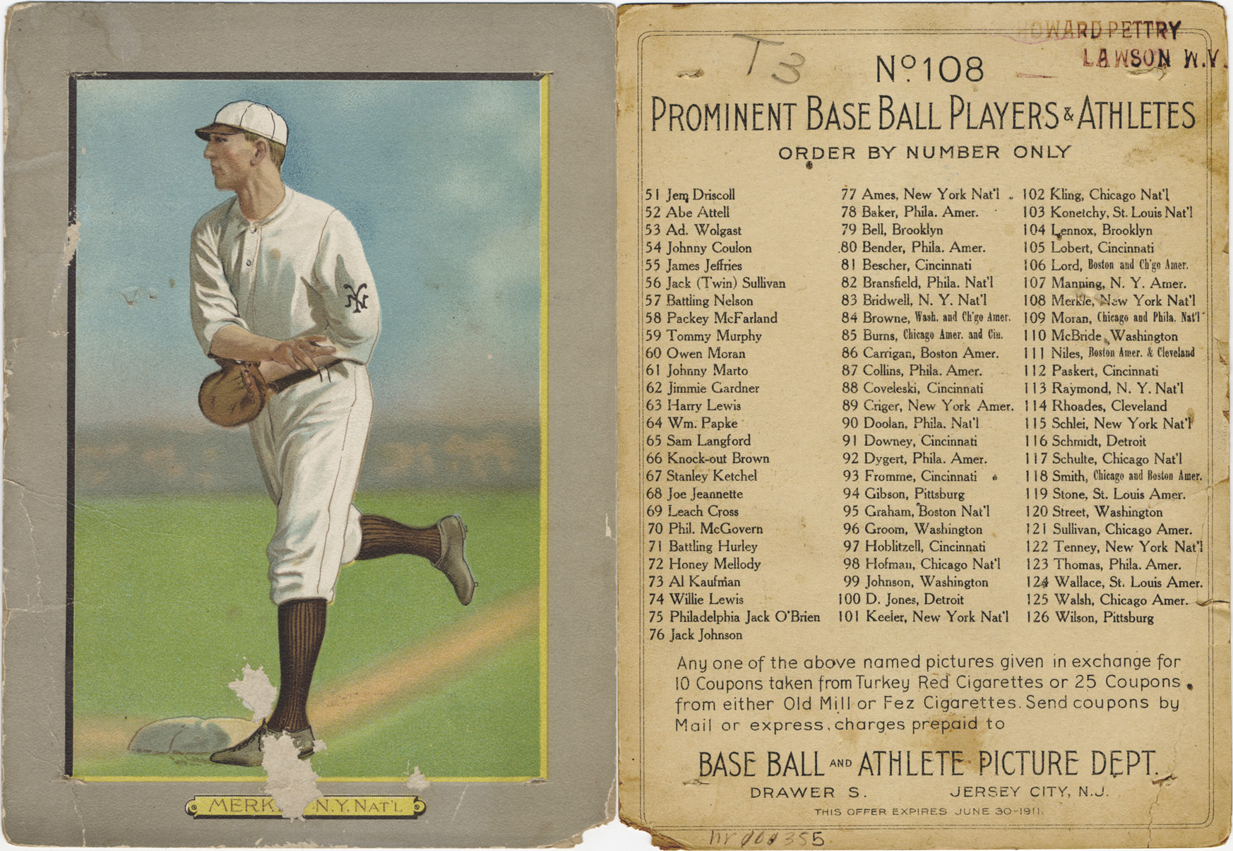 Portrait of Fred Merkle, baseball player for the New York Giants. Turkey Red Cabinets (T3) series. Printed on front: "Merk[le], N.Y. Nat'l." Printed on back: "No. 108, prominent baseball players & athletes, order by number only. 51. Jem Driscoll; 52. Abe Attell; 53. Ad. Wolgast; 54. Johnny Coulon; 55. James Jeffries; 56. Jack (Twin) Sullivan; 57. Battling Nelson; 58. Packey McFarland; 59. Tommy Murphy; 60. Owen Moran; 61. Johnny Marto; 62. Jimmie Gardner; 63. Harry Lewis; 64. Wm. Papke; 65. Sam Langford; 66. Knock-out Brown; 67. Stanley Ketchel; 68. Joe Jeannette; 69. Leach Cross; 70. Phil. McGovern; 71. Battling Hurley; 72. Honey Mellody; 73. Al Kaufman; 74. Willie Lewis; 75. Philadelphia Jack O'Brien; 76. Jack Johnson; 77. Ames, N.Y. Nat'l; 78. Baker, Phila. Amer.; 79. Bell, Brooklyn; 80. Bender, Phila. Amer.; 81. Bescher, Cincinnati; 82. Bransfield, Phila. Nat'l; 83. Bridwell, N.Y. Nat'l; 84. Browne, Wash. and Ch'go Amer.; 85. Burns, Chicago Amer. and Cin.; 86. Carrigan, Boston Amer.; 87. Collins, Phila. Amer.; 88. Coveleski, Cincinnati; 89. Criger, New York Amer.; 90. Doolan, Phila. Amer.; 91. Downey, Cincinnati; 92. Dygert, Phila. Amer.; 93. Fromme, Cincinnati; 94. Gibson, Pittsburgh; 95. Graham, Boston Nat'l; 96. Groom, Washington; 97. Hoblitzell, Cincinnati; 98. Hofman, Chicago Nat'l; 99. Johnson, Washington; 100. D. Jones, Detroit; 101. Keeler, New York Nat'l; 102. Kling, Chicago Nat'l; 103. Konetchy, St. Louis Nat'l; 104. Lennox, Brooklyn; 105. Lobert, Cincinnati; 106. Lord, Boston and Ch'go Amer.; 107. Manning, N.Y. Amer.; 108. Merkle, New York Nat'l; 109. Moran, Chicago and Phila. Nat'l; 110. McBride, Washington; 111. Niles, Boston Amer. & Cleveland; 112. Paskert, Cincinnati; 113. Raymond, N.Y. Nat'l; 114. Rhoades, Cleveland; 115. Schlei, New York Nat'l; 116. Schmidt, Detroit; 117. Schulte, Chicago Nat'l; 118. Smith, chicago and Boston Amer.; 119. Stone, St. Louis Amer.; 120. Street, Washington; 121. Sullivan, Chicago Amer.; 122. Tenney, New York Nat'l; 123. Thomas, Phila. Amer.; 124. Wallace, St. Louis Amer.; 125. Walsh, Chicago Amer.; 126. Wilson, Pittsburgh. Any one of the above named pictures given in exchange for 10 coupons taken from Turkey Red cigarettes or 25 coupons from either Old Mill or Fez cigarettes. Send coupons by mail or express, charges prepaid to Baseball and Athlete Picture Dept., Drawer S. Jersey City, N.J. This offer expires June 30, 1911."