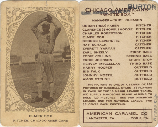 Portrait of Dick Cox, pitcher for the Chicago White Sox. American Caramel (E120) series. Printed on front: "Elmer Cox, pitcher, Chicago Americans." Printed on back: "Chicago Americans, 'White Sox.' Manager, 'Kid' Gleason. Urban (Red) Faber, pitcher; Clarence (Shovel) Hodge, pitcher; Charles Robertson, pitcher; Elmer Cox, pitcher; George Leverette, pitcher; Ray Schalk, catcher; Everett Yaryan, catcher; Earl Sheely, first base; Eddie Collins, second base; Ernie Johnson, short stop; Hervey McClellan, third base; Harry Hooper, outfield; Bib Falk, outfield; Johnny Mostil, outfield; Amos Strunk, outfield. This picture is one of a series of 240 pictures of baseball stars -- 15 players in each of the 16 major league teams. We supply handsome blank albums to hold 120 pictures -- one for American League, one for National League -- for 16 cents each postpaid. American Caramel Co., Lancaster, Pa. York, Pa."