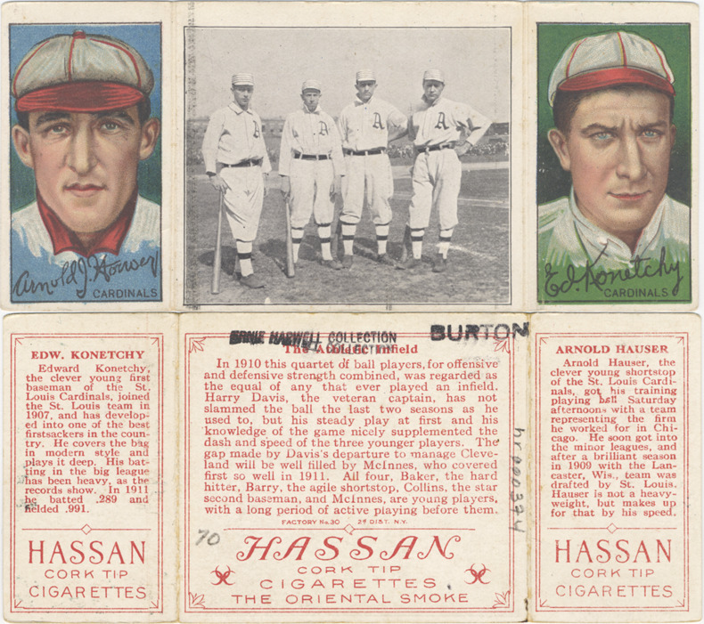 Portraits of Arnold Hauser, shortstop for the St. Louis Cardinals and Ed Konetchy, first baseman for the St. Louis Cardinals. Inset portrait of Frank Baker, Jack Barry, Eddie Collins and Stuffy McInnis of the Philadelphia Athletics. Hassan Triple Folders (T202) series. Printed on front: "Arnold J. Hauser, Cardinals; Ed. Konetchy, Cardinals." Printed on back: "Edw. Konetchy. Edward Konetchy, the clever young first baseman of the St. Louis Cardinals, joined the St. Louis team in 1907, and has developed into one of the best firstsackers in the country. He covers the bag in modern style and plays it deep. His batting in the big league has been heavy, as the records show. In 1911 he batted .289 and fielded .991. The Athletic Infield. In 1910 this quartet of ball players, for offensive and defensive strength combined, was regarded as the equal of any that ever played an infield. Harry Davis, the veteran captain, has not slammed the ball the last two seasons as he used to, but his steady play at first and his knowledge of the game nicely supplemented the dash and speed of the three younger players. The gap made by Davis's departure to manage Cleveland will be well filled by McInnes, who covered first so well in 1911. All four, Baker, the hard hitter, Barry, the agile shortsop, Collins, the star second baseman, and McInnes, are young players, with a long period of active playing before them. Facotry no. 30, 2d. dist., N.Y. Arnold Hauser. Arnold Hauser, the clever young shortstop of the St. Louis Cardinals, got his training playing ball Saturday afternoons with a team representing the firm he worked for in Chicago. He soon got into the minor leagues, and after a brilliant season in 1909 with the Lancaster, Wis., team was drafted by St. Louis. Hauser is not a heavyweight, but makes up for that by his speed. Hassan cork tip cigarettes, the Oriental smoke."