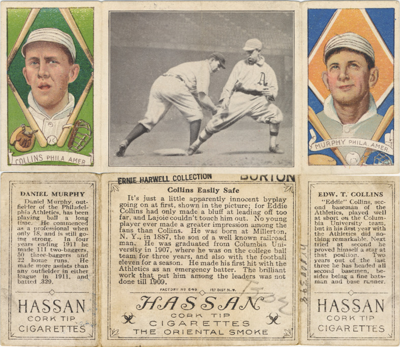 Portraits of Eddie Collins, second baseman for the Philadelphia Athletics and Danny Murphy, outfielder for the Philadelphia Athletics. Center image depicts Collins being tagged by Nap Lajoie of the Cleveland Naps. Hassan Triple Folders (T202) series. Printed on front: "Collins, Phila. Amer.; Murphy, Phila. Amer." Printed on back: "Daniel Murphy. Daniel Murphy, outfielder of the Philadelphia Athletics, has been playing ball along time. He commenced as a professional when only 18, and is still going strong. In four years ending 1911 he made 111 two-baggers, 50 three-baggers and 22 home runs. He made more assists than any outfielder in either league in 1911, and batted .329. Collins easily safe. It's just a little apparently innocent byplay going on at first, shown in the picture; for Eddie Collins had only made a bluff at leading off too far, and Lajoie couldn't touch him out. No young player ever made a greater impression among the fans than Collins. He was born at Millerton, N.Y., in 1887, the son of a well known railroad man. He was graduated from Columbia University in 1907, where he was on the college ball team for three years, and also with the football eleven for a season. He made his first hit with the Athletics as an emergency batter. The brilliant work that put him among the leaders was not done till 1909. Factory no. 640, 1st dist. N.Y. Edw. T. Collins. 'Eddie' Collins, second baseman of the Athletics, played well at short on the Columbia University team, but in his first year with the Athletics did nothing remarkable. Next tried at second he proved himself a star at that position. Two years out of the last three he has headed all second basemen, besides being a fine batsman and base runner. Hassan cork tip cigarettes, the Oriental smoke."