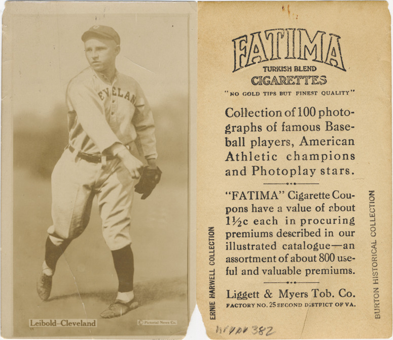 Portrait of Nemo Leibold, baseball player for the Cleveland Naps. Fatima Players (T222) series. Printed on front: "Leibold, Cleveland. [Copyright] Pictorial News Co." Printed on back: "Fatima Turkish blend cigarettes. 'No gold tips but finest quality.' Collection of 100 photographs of famous baseball players, American athletic champions and Photoplay stars. 'Fatima' cigarette coupons have a value of about 1 1/2 c each in procuring premiums described in our illustrated catalogue, an assortment of about 800 useful and valuable premiums. Liggett & Myers Tob. Co. Factory no. 25, second district of Va."