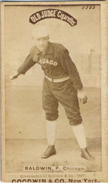 Portrait of Mark Baldwin, pitcher for the Chicago White Stockings. Posed in studio, wearing uniform, with right arm back with ball. Old Judge (N172) series. Printed on front: "0383. Old Judge cigarettes. Baldwin, P. Chicago. Copyrighted by Goodwin & Co. 1887. Goodwin & Co. New York."