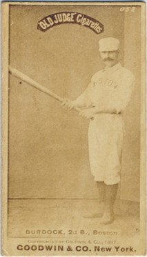Portrait of Jack Burdock, second baseman for the Boston Beaneaters. Posed in studio, wearing uniform and holding bat. Old Judge (N172) series. Printed on front: "052. Old Judge cigarettes. Burdock, 2nd B., Boston. Copyrighted by Goodwin & Co., 1887. Goodwin & Co. New York."