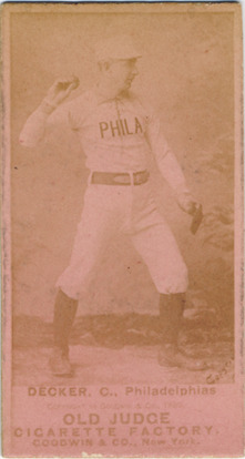 Portrait of Harry Decker, catcher for the Philadelphia Quakers. Posed in studio wearing uniform, right arm raised to throw ball. Old Judge (N172) series. Printed on front: "Copyr[ight ?] Decker, C., Philadelphias. Copyrighted by Goodwin & Co., 1889. Old Judge cigarettes. Goodwin & Co., New York."