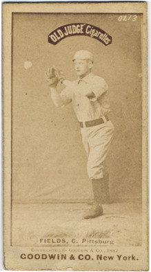 Portrait of Jocko Fields, catcher for the Pittsburg Alleghenys. Posed in studio wearing uniform, hands up to catch ball in mid-air. Old Judge (N172) series. Printed on front: "0213. Old Judge cigarettes. Fields, C. Pittsburg. Copyrighted by Goodwin & Co., 1887. Goodwin & Co. New York."