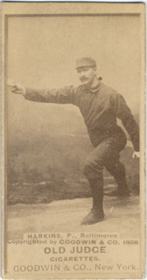 Portrait of John Harkins, pitcher for the Baltimore Orioles. Posed in studio wearing dark uniform, right arm extended as if pitching ball. Old Judge (N172) series. Printed on front: "Harkins, P., Baltimores. Copyrighted by Goodwin & Co. 1888. Old Judge cigarettes. Goodwin & Co., New York."