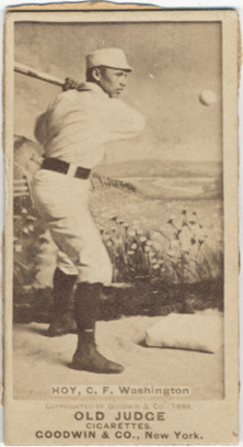 Portrait of Dummy Hoy, center fielder for the Washington Nationals. Posed in studio wearing uniform, in batting stance with ball in mid-air. Old Judge (N172) series. Printed on front: "Hoy, C.F. Washington. Copyrighted by Goodwin & Co., 1888. Old Judge cigarettes. Goodwin & Co., New York."