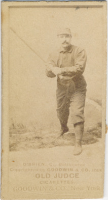 Portrait of Jack O'Brien, catcher for the Baltimore Orioles. Posed in studio wearing uniform, facing camera and stepping forward with bat raised. Old Judge (N172) series. Printed on front: "O'Brien, C., Baltimores. Copyrighted by Goodwin & Co. 1888. Old Judge cigarettes. Goodwin & Co., New York."