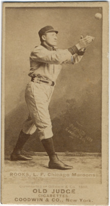Portrait of George Rooks, left fielder for the Chicago Maroons. Posed in studio wearing uniform, reaching with ungloved hands for ball in mid-air. Old Judge (N172) series. Printed on front: "Copyright 1888, Goodwin & Co. Rooks, L.F., Chicago Maroons. Copyrighted by Goodwin & Co., 1888. Old Judge cigarettes. Goodwin & Co., New York."