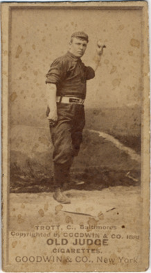 Portrait of Sam Trott, catcher for the Baltimore Orioles. Posed in studio wearing dark uniform, left hand raised to throw ball. Old Judge (N172) series. Printed on front: "Trott, C., Baltimores. Copyrighted by Goodwin & Co., 1888. Old Judge cigarettes. Goodwin & Co., New York."