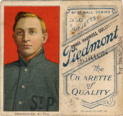 Favorite this☆ Herman Armbruster Description: Portrait of baseball player Herman Armbruster. White Borders (T206) series. Printed on front: "Armbruster, St. Paul." Printed on back: "Piedmont, the cigarette of quality. Base ball series, 350 subjects. Factory no. 25, 2d. dist. Va." Details Resource ID: hr000504 Subject: Armbruster, Herman, 1882-1953 Baseball players--Minneapolis--Saint Paul Minor league baseball--Minneapolis--Saint Paul Baseball cards Cigarette cards Publisher: American Tobacco Company Date Issued: 1909 to 1911 Format: 1 cigarette card : col. ; 2.75 x 1.5 in. Member of: Ernie Harwell Sports Collection Filing Location: Cigarette cards-American Tobacco Company-White Borders (T206)-1909-1911-Armbruster, Herman Rights: Physical rights are retained by DPL. Copyright is retained in accordance with U.S. copyright laws.