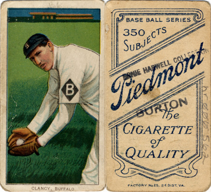 Favorite this☆ Bill Clancy Description: Portrait of baseball player Bill Clancy catching a baseball. White Borders (T206) series. Printed on front: "Clancy, Buffalo." Printed on back: "Piedmont, the cigarette of quality. Base ball series, 350 subjects. Factory no. 25, 2d. dist. Va." Details Resource ID: hr000562 Subject: Clancy, Bill (William Edward), 1879-1948 Baseball players--New York (State)--Buffalo Minor league baseball--New York (State)--Buffalo Baseball cards Cigarette cards Publisher: American Tobacco Company Date Issued: 1909 to 1911 Format: 1 cigarette card : col. ; 2.75 x 1.5 in. Member of: Ernie Harwell Sports Collection Filing Location: Cigarette cards-American Tobacco Company-White Borders (T206)-1909-1911-Clancy, Bill Rights: Physical rights are retained by DPL. Copyright is retained in accordance with U.S. copyright laws.