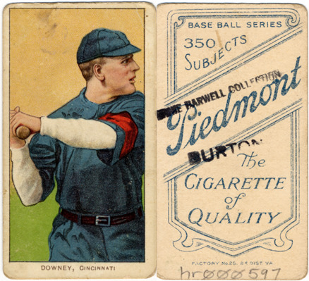 Portrait of Tom Downey, baseball player for the Cincinnati Reds, holding a baseball bat. White Borders (T206) series. Printed on front: "Downey, Cincinnati." Printed on back: "Piedmont, the cigarette of quality. Base ball series, 350 subjects. Factory no. 25, 2d. dist. Va."