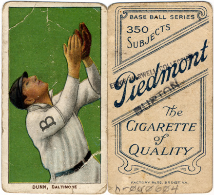 Favorite this☆ Jack Dunn Description: Portrait of Jack Dunn, baseball player for the Baltimore Orioles. White Borders (T206) series. Printed on front: "Dunn, Baltimore." Printed on back: "Piedmont, the cigarette of quality. Base ball series, 350 subjects. Factory no. 25, 2d. dist. Va." Details Resource ID: hr000604 Subject: Dunn, Jack (John Joseph), 1872-1928 Baseball players--Maryland--Baltimore Baltimore Orioles (Baseball team) Baseball cards Cigarette cards Publisher: American Tobacco Company Date Issued: 1909 to 1911 Format: 1 cigarette card : col. ; 2.75 x 1.5 in. Member of: Ernie Harwell Sports Collection Filing Location: Cigarette cards-American Tobacco Company-White Borders (T206)-1909-1911-Dunn, Jack Rights: Physical rights are retained by DPL. Copyright is retained in accordance with U.S. copyright laws.