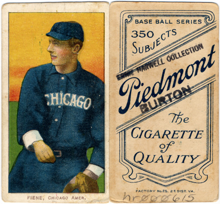 Portrait of Lou Fiene, baseball player for the Chicago White Sox. White Borders (T206) series. Printed on front: "Fiene, Chicago Amer." Printed on back: "Piedmont, the cigarette of quality. Base ball series, 350 subjects. Factory no. 25, 2d. dist. Va."