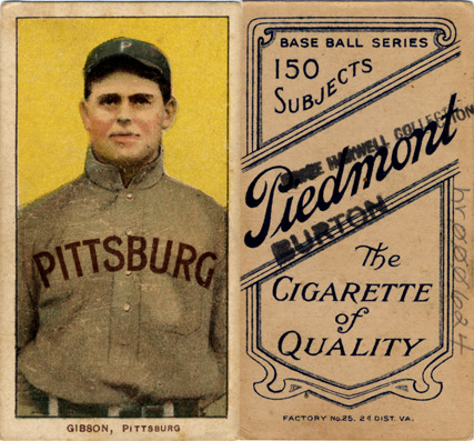 Portrait of George Gibson, baseball player for the Pittsburgh Pirates. White Borders (T206) series. Printed on front: "Gibson, Pittsburgh." Printed on back: "Piedmont, the cigarette of quality. Base ball series, 150 subjects. Factory no. 25, 2d. dist. Va."