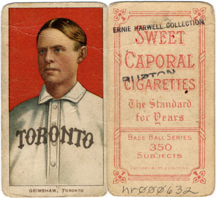 Portrait of baseball player Moose Grimshaw. White Borders (T206) series. Printed on front: "Grimshaw, Toronto." Printed on back: "Sweet Caporal cigarettes, the standard for years. Base ball series, 350 subjects. Factory no. 30, 2d. dist. N.Y."