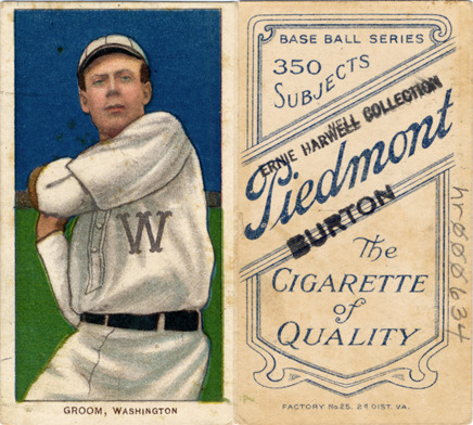 Portrait of Bob Groom, baseball player for the Washington Senators. White Borders (T206) series. Printed on front: "Groom, Washington." Printed on back: "Piedmont, the cigarette of quality. Base ball series, 350 subjects. Factory no. 25, 2d. dist. Va."