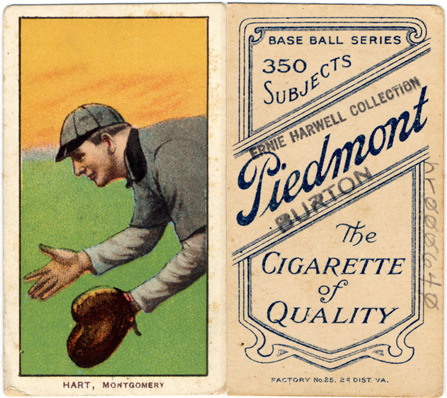 Favorite this☆ Jimmy Hart Description: Portrait of baseball player Jimmy Hart. White Borders (T206) series. Printed on front: "Hart, Montgomery." Printed on back: "Piedmont, the cigarette of quality. Base ball series, 350 subjects. Factory no. 25, 2d. dist. Va." Details Resource ID: hr000640 Subject: Hart, Jimmy Baseball players--Alabama--Montgomery Minor league baseball--Alabama--Montgomery Baseball cards Cigarette cards Publisher: American Tobacco Company Date Issued: 1909 to 1911 Format: 1 cigarette card : col. ; 2.75 x 1.5 in. Member of: Ernie Harwell Sports Collection Filing Location: Cigarette cards-American Tobacco Company-White Borders (T206)-1909-1911-Hart, Jimmy Rights: Physical rights are retained by DPL. Copyright is retained in accordance with U.S. copyright laws.