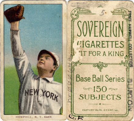 Portrait of Charlie Hemphill, baseball player for the New York Highlanders. White Borders (T206) series. Printed on front: "Hemphill, N.Y. Amer." Printed on back: "Sovereign cigarettes, fit for a king. Base ball series, 150 subjects. Factory no. 25, 2d. dist. Va." Handwritten on back: "5; R.F."