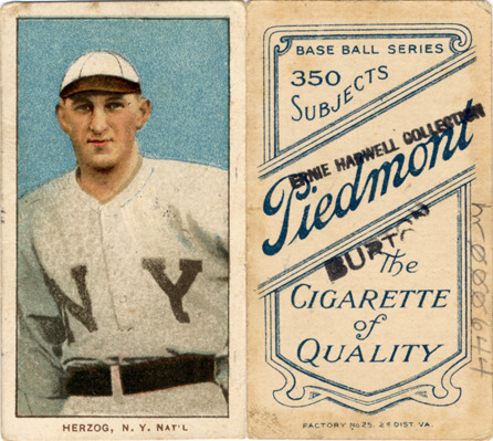 Portrait of Buck Herzog, baseball player for the New York Giants. White Borders (T206) series. Printed on front: "Herzog, N.Y. Nat'l." Printed on back: "Piedmont, the cigarette of quality. Base ball series, 350 subjects. Factory no. 25, 2d. dist. Va."