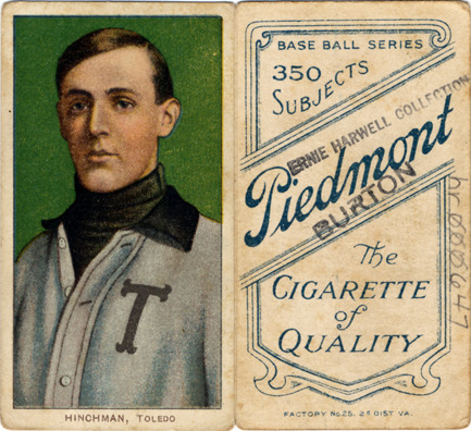Portrait of Harry Hinchman, baseball player for the Toledo Mud Hens. White Borders (T206) series. Printed on front: "Hinchman, Toledo." Printed on back: "Piedmont, the cigarette of quality. Base ball series, 350 subjects. Factory no. 25, 2d. dist. Va."
