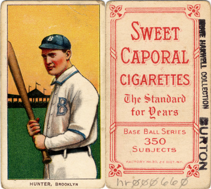 Portrait of George Hunter, baseball player for the Brooklyn Superbas, holding a baseball bat. White Borders (T206) series. Printed on front: "Hunter, Brooklyn." Printed on back: "Sweet Caporal cigarettes, the standard for years. Base ball series, 350 subjects. Factory no. 30, 2d. dist. N.Y."