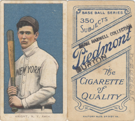 Portrait of John Knight, baseball player for the New York Highlanders, holding a baseball bat. White Borders (T206) series. Printed on front: "Knight, N.Y. Amer." Printed on back: "Piedmont, the cigarette of quality. Base ball series, 350 subjects. Factory no. 25, 2d. dist. Va."