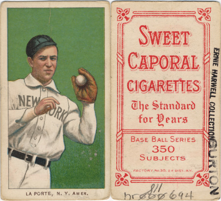 Portrait of Frank LaPorte, baseball player for the New York Highlanders. White Borders (T206) series. Printed on front: "La Porte, N.Y. Amer." Printed on back: "Sweet Caporal cigarettes, the standard for years. Base ball series, 350 subjects. Factory no. 30, 2d. dist. N.Y."