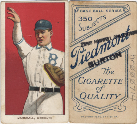 Portrait of Doc Marshall, baseball player for the Brooklyn Superbas. White Borders (T206) series. Printed on front: "Marshall, Brooklyn." Printed on back: "Piedmont, the cigarette of quality. Base ball series, 350 subjects. Factory no. 25, 2d. dist. Va."