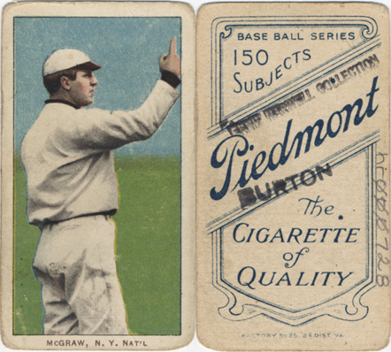 Portrait of John McGraw, baseball player for the New York Giants. White Borders (T206) series. Printed on front: "McGraw, N.Y. Nat'l." Printed on back: "Piedmont, the cigarette of quality. Base ball series, 150 subjects. Factory no. 25, 2d. dist. Va."