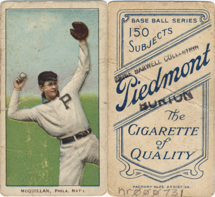 Portrait of George McQuillan, baseball player for the Philadelphia Phillies. White Borders (T206) series. Printed on front: "McQuillan, Phila. Nat'l." Printed on back: "Piedmont, the cigarette of quality. Base ball series, 150 subjects. Factory no. 25, 2d. dist. Va."
