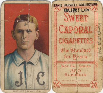 Favorite this☆ Danny Moeller Description: Portrait of baseball player Danny Moeller. White Borders (T206) series. Printed on front: "Moeller, Jersey City." Printed on back: "Sweet Caporal cigarettes, the standard for years. Base ball series, 350 subjects. Factory no. 30, 2d. dist. N.Y." Details Resource ID: hr000741 Subject: Moeller, Danny (Daniel Edward), 1885-1951 Baseball players--New Jersey--Jersey City Minor league baseball--New Jersey--Jersey City Baseball cards Cigarette cards Publisher: American Tobacco Company Date Issued: 1909 to 1911 Format: 1 cigarette card : col. ; 2.75 x 1.5 in. Member of: Ernie Harwell Sports Collection Filing Location: Cigarette cards-American Tobacco Company-White Borders (T206)-1909-1911-Moeller, Danny Rights: Physical rights are retained by DPL. Copyright is retained in accordance with U.S. copyright laws.