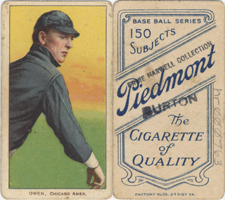 Portrait of Frank Owen, baseball player for the Chicago White Sox. White Borders (T206) series. Printed on front: "Owen, Chicago Amer." Printed on back: "Piedmont, the cigarette of quality. Base ball series, 150 subjects. Factory no. 25, 2d. dist. Va."