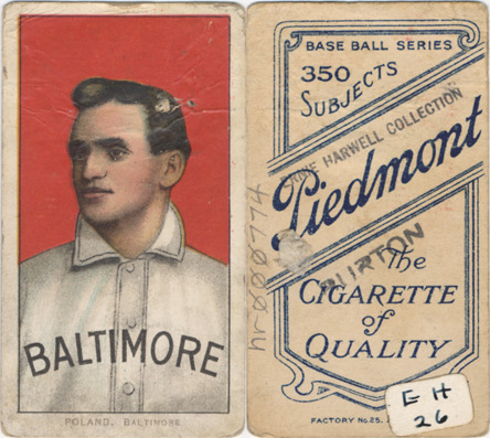 Favorite this☆ Phil Poland Description: Portrait of baseball player Phil Poland. White Borders (T206) series. Printed on front: "Poland, Baltimore." Printed on back: "Piedmont, the cigarette of quality. Base ball series, 350 subjects. Factory no. 25, [2d. dist. Va.]" Details Resource ID: hr000774 Subject: Poland, Phil Baseball players--Maryland--Baltimore Minor league baseball--Maryland--Baltimore Baseball cards Cigarette cards Publisher: American Tobacco Company Date Issued: 1909 to 1911 Format: 1 cigarette card : col. ; 2.75 x 1.5 in. Member of: Ernie Harwell Sports Collection Filing Location: Cigarette cards-American Tobacco Company-White Borders (T206)-1909-1911-Poland, Phil Rights: Physical rights are retained by DPL. Copyright is retained in accordance with U.S. copyright laws.