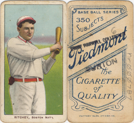 Portrait of Claude Ritchey, baseball player for the Boston Doves, holding a baseball bat. White Borders (T206) series. Printed on front: "Ritchey, Boston Nat'l." Printed on back: "Piedmont, the cigarette of quality. Base ball series, 350 subjects. Factory no. 25, 2d. dist. Va."