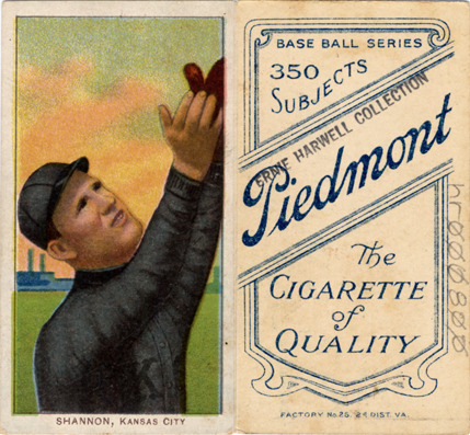 Portrait of Spike Shannon, baseball player for the Kansas City Blues. White Borders (T206) series. Printed on front: "Shannon, Kansas City." Printed on back: "Piedmont, the cigarette of quality. Base ball series, 350 subjects. Factory no. 25, 2d. dist. Va."