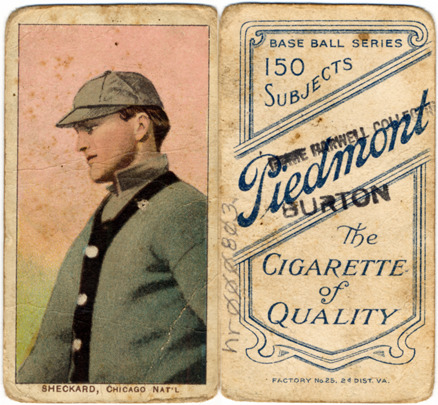 Portrait of Jimmy Sheckard, baseball player for the Chicago Cubs. White Borders (T206) series. Printed on front: "Sheckard, Chicago Nat'l." Printed on back: "Piedmont, the cigarette of quality. Base ball series, 150 subjects. Factory no. 25, 2d. dist. Va."