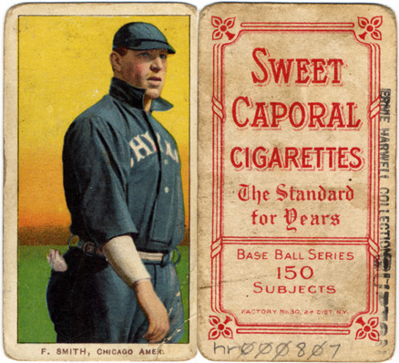 Portrait of Frank Smith, baseball player for the Chicago White Sox. White Borders (T206) series. Printed on front: "F. Smith, Chicago Amer." Printed on back: "Sweet Caporal cigarettes, the standard for years. Base ball series, 150 subjects. Factory no. 30, 2d. dist. N.Y."