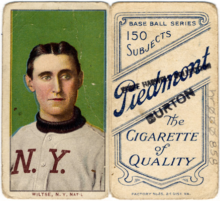 Portrait of Hooks Wiltse, baseball player for the New York Giants. White Borders (T206) series. Printed on front: "Wiltse, N.Y. Nat'l." Printed on back: "Piedmont, the cigarette of quality. Base ball series, 150 subjects. Factory no. 25, 2d. dist. Va."