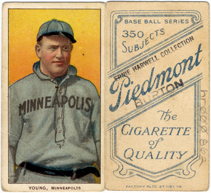 Favorite this☆ Irv Young Description: Portrait of baseball player Irv Young. White Borders (T206) series. Printed on front: "Young, Minneapolis." Printed on back: "Piedmont, the cigarette of quality. Base ball series, 350 subjects. Factory no. 25, 2d. dist. Va." Details Resource ID: hr000862 Subject: Young, Irv (Irving Melrose), 1877-1935 Baseball players--Minnesota--Minneapolis Minor league baseball--Minnesota--Minneapolis Baseball cards Cigarette cards Publisher: American Tobacco Company Date Issued: 1909 to 1911 Format: 1 cigarette card : col. ; 2.75 x 1.5 in. Member of: Ernie Harwell Sports Collection Filing Location: Cigarette cards-American Tobacco Company-White Borders (T206)-1909-1911-Young, Irv Rights: Physical rights are retained by DPL. Copyright is retained in accordance with U.S. copyright laws.