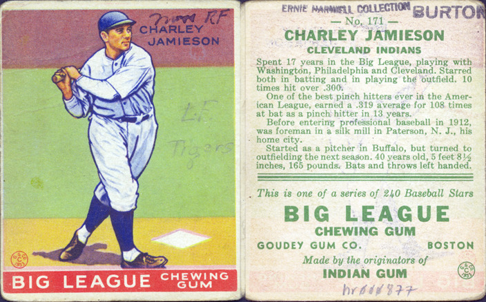 Portrait of Charlie Jamieson, baseball player for the Cleveland Indians, holding a baseball bat. Big League Chewing Gum (R-319) series. Printed on front: "Charley Jamieson, Big League chewing gum, G.G. Co., 1933." Handwritten on front: "Now RF, L.F. Tigers." Printed on back: "No. 171, Charley Jamieson, Cleveland Indians. Spent 17 years in the big league, playing with Washington, Philadelphia and Cleveland. Starred both in batting and in playing the outfield. 10 times hit over .300. One of the best pinch hitters ever in the American League, earned a .319 average for 108 times at bat as a pinch hitter in 13 years. Before entering professional baseball in 1912, was foreman in a silk mill in Paterson, N.J., his home city. Started as a pitcher in Buffalo, but turned to outfielding the next season. 40 years old, 5 feet 8-1/2 inches, 165 pounds. Bats and throws left handed. This is one of a series of 240 baseball stars. Big League chewing gum, Goudey Gum Co., Boston. Made by the originators of Indian gum, G.G. Co., 1933."