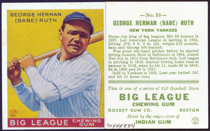 Portrait of Babe Ruth, baseball player for the New York Yankees, holding a baseball bat. Big League Chewing Gum (R-319) series. Printed on front: "George Herman (Babe) Ruth, Big League chewing gum, G.G. Co., 1933." Printed on back: "No. 53, George Herman (Babe) Ruth, New York Yankees. Home run king of big leagues. Hit 60 homers in 1927. Led American League in batting in 1924, hitting .378. 6 ft. 2 in. tall, weighs 210 pounds, bats and throws left-handed. Was great left-hand pitcher before he started hitting homers. Born in Baltimore in 1894. Joined Red Sox in 1914 from Baltimore club. Led league in pitching in 1916. Started hitting home runs in earnest in 1918, when he hit 11, made 29 in 1919, 54 in 1920 and 59 in 1921. Sold to Yankees in 1920. Last year batted .341 and hit 41 home runs. This is one of a series of 240 baseball stars. Big League chewing gum, Goudey Gum Co., Boston. Made by the originators of Indian gum, G.G. Co., 1933."