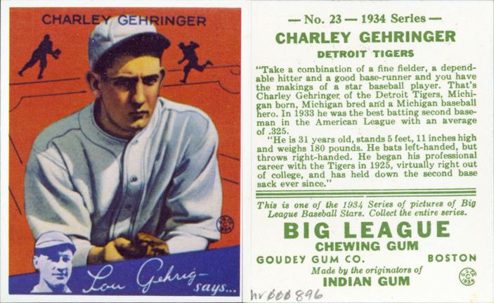 Portrait of Charlie Gehringer, baseball player for the Detroit Tigers. Inset portrait of Lou Gehrig. Big League Chewing Gum (R-320) series. Printed on front: "Charley Gehringer. Lou Gehrig says. G.G. Co., 1934." Printed on back: "No. 23, 1934 series. Charley Gehringer, Detroit Tigers. Take a combination of a fine fielder, a dependable hitter and good base-runner and you have the making of a star baseball player. That's Charley Gehringer of the Detroit Tigers, Michigan born, Michigan bred and a Michigan baseball hero. In 1933 he was the best batting second baseman in the American League with an average of .325. He is 31 years old, stands 5 feet, 11 inches high and weighs 180 pounds. He bats left-handed, but throws right-handed. He began his professional career with the Tigers in 1925, virtually right out of college, and has held down the second base sack ever since. This is one of the 1934 series of pictures of Big League baseball stars. Collect the entire series. Big League chewing gum, Goudey Gum Co., Boston. Made by the originators of Indian gum. G.G. Co., 1934."