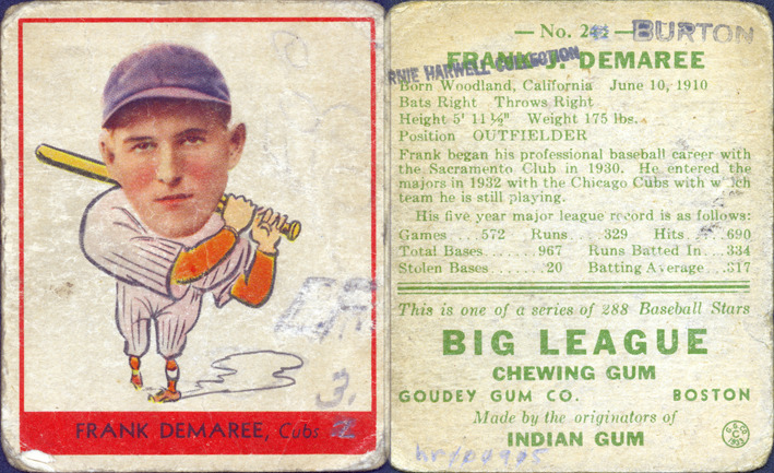 Portrait of Frank Demaree, baseball player for the Chicago Cubs, holding a baseball bat. Big League Chewing Gum "Heads-Up" (R-323) series. Handwritten on front: "3." Printed on front: "Frank Demaree, Cubs." Printed on back: "No. 24, Frank Demaree. Born Woodland, California, June 10, 1910. Bats right. Throws right. Height 5' 11-1/2". Weight 175 lbs. Position, outfielder. Frank began his professional baseball career with the Sacramento Club in 1930. He entered the majors in 1932 with the Chicago Cubs with which team he is still playing. His five year major league record is as follows: Games, 572. Runs, 329. Hits, 690. Total bases, 967. Runs batted in, 334. Stolen bases, 20. Batting average, .317. This is one of a series of 288 baseball stars. Big League chewing gum, Goudey Gum Co., Boston. Made by the originators of Indian gum. G.G. Co., 1933."