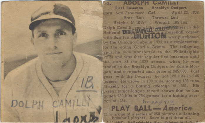 Head-and-shoulders portrait of Dolph Camilli, first baseman for the Brooklyn Dodgers. Play Ball series. Handwritten on front: "1B. Dolph Camilli." Printed on back: "[8?]6. Adolph Camilli. First baseman. Brooklyn Dodgers. Born: San Francisco, Cal., April 23, 1908. Bats: Left. Throws: Left. Height: 5' 10 1/2". Weight: 185 lbs. Dolph Camilli, one of the hardest hitters in the National League, started his baseball career with San Francisco in 1926. He was purchased by the Chicago Cubs in 1933 as a replacement for the aging Charlie Grimm. The following year he was transferred to the Philadelphia Phils and was their regular first baseman until the start of the 1928 [1938] season, when he was traded to the Brooklyn Dodgers for Eddie Morgan, and a reported cash price of $45,000. Last year, with the Dodgers, he got 128 hits in 146 games. He drove in 100 runs, scoring 106 runs himself, for a batting average of .251. His 6-year major-league record shows that he has gotten 759 hits in 754 games, for a batting average of .284. Play Ball - America. This is one of a series of 250 pictures of leading baseball players. Save to get them all. [Gum, Inc., Philadelphia, Pa. Printed in U.S.A.]"