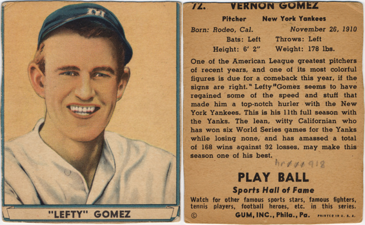 Head-and-shoulders colored portrait of Lefty Gomez, pitcher for the New York Yankees. Play Ball series. Printed on front, in banner along bottom edge: "'Lefty' Gomez." Printed on back: "72. Vernon Gomez. Pitcher. New York Yankees. Born: Rodeo, Cal., November 26, 1910. Bats: Right. Throws: Right. Height: 6'. Weight: 190 lbs. One of the American League greatest pitchers of recent years, and one of its most colorful figures is due for a comeback this year, if the signs are right. 'Lefty' Gomez seems to have regained some of the speed and stuff that made him a top-notch hurler with the New York Yankees. This is his 11th full season with the Yanks. The lean, witty Californian who has won six world Series games for the Yanks while losing none, and has amassed a total of 168 wins against 92 losses, may make this season one of his best. Play Ball. Sports Hall of Fame. Watch for other famous sports stars, famous fighters, tennis players, football heroes, etc. in this series. [Copyright] Gum, Inc., Phila., Pa. Printed in U.S.A."